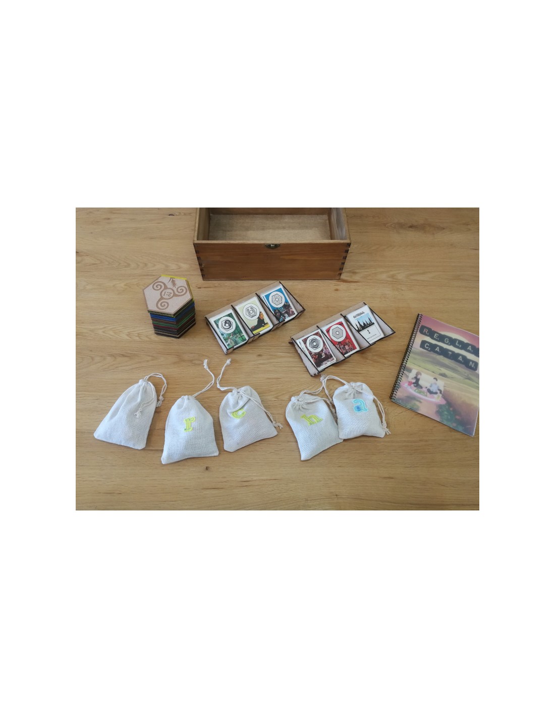 - Diseño Exclusivo: Los hexágonos de los recursos, las cartas (fichas) y el dado están fabricados con cuidado