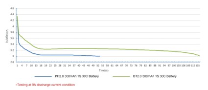 Consulta el gráfico a continuación que compara el conector BT2.0 y el conector PH2.0 (versión de pines sólidos) en la batería BETAFPV 1S de 300mAh. La corriente de descarga es de 9A en esta prueba. El BT2.0 tiene el doble de tiempo (unos 2 minutos) y una mejora de 0,2v en la caída de voltaje.