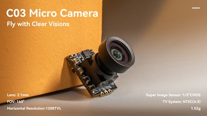 La microcámara C03 FPV tiene un peso ultraligero de 1,45g y es una gran cámara para cuadricópteros micro FPV de interior. Cuenta con una definición 1200TVL con sensor CMOS de 1/3", objetivo de 2,1 mm para un campo de visión de 160° y excelente latencia, que ofrece imágenes de alta calidad, claras y nítidas a través de tus gafas.