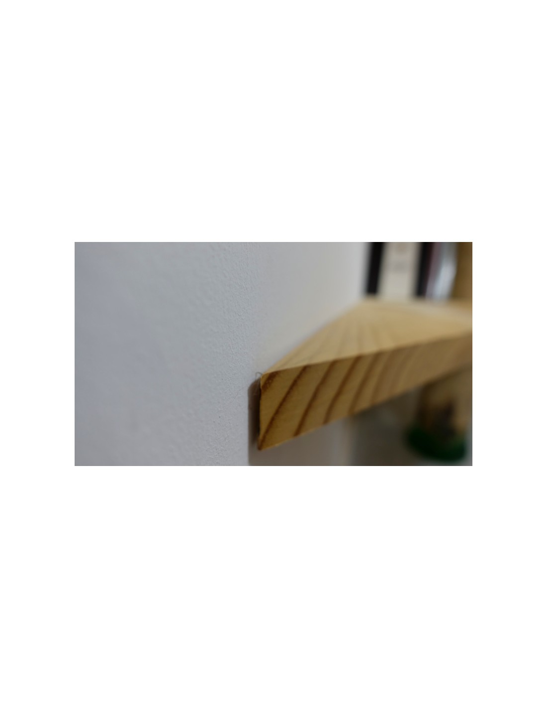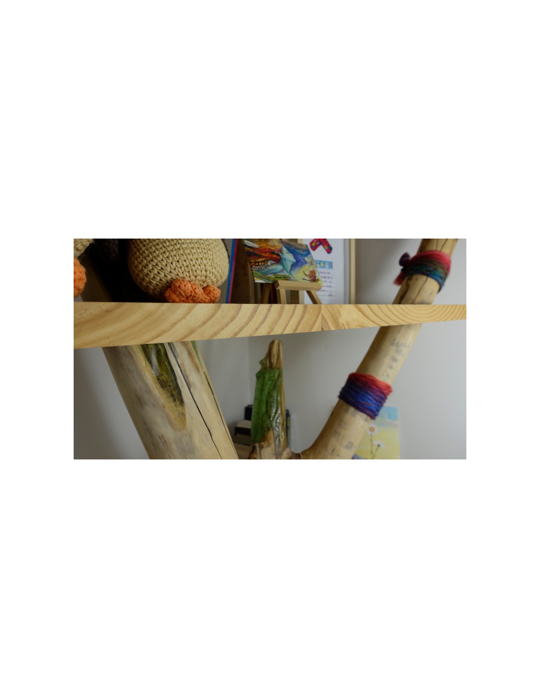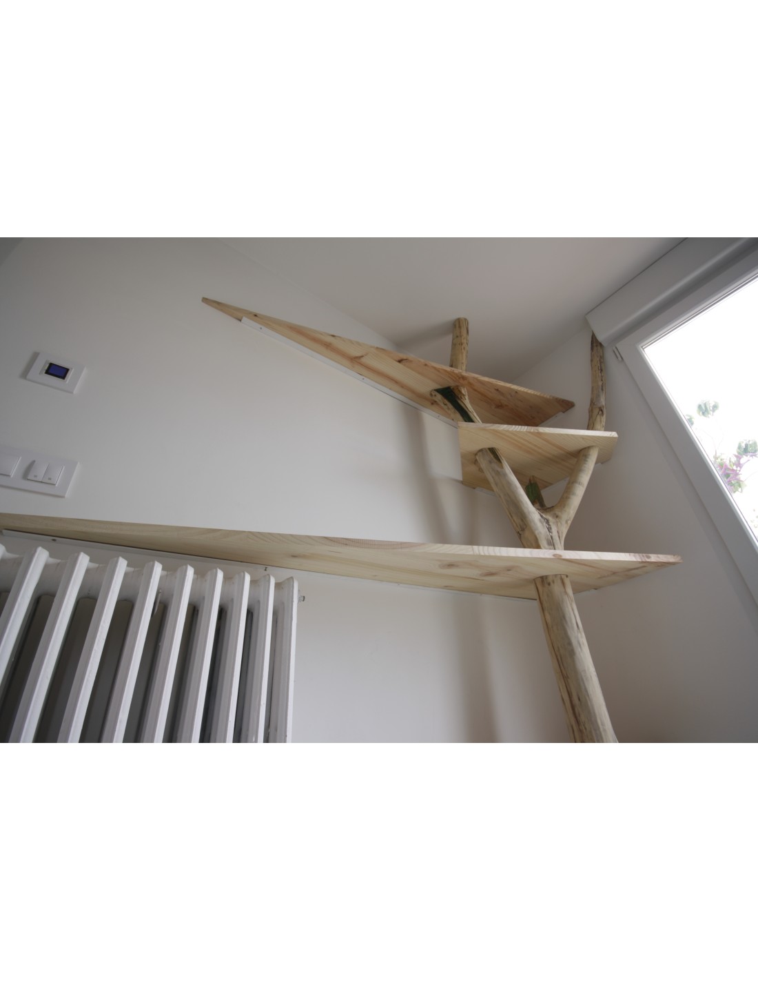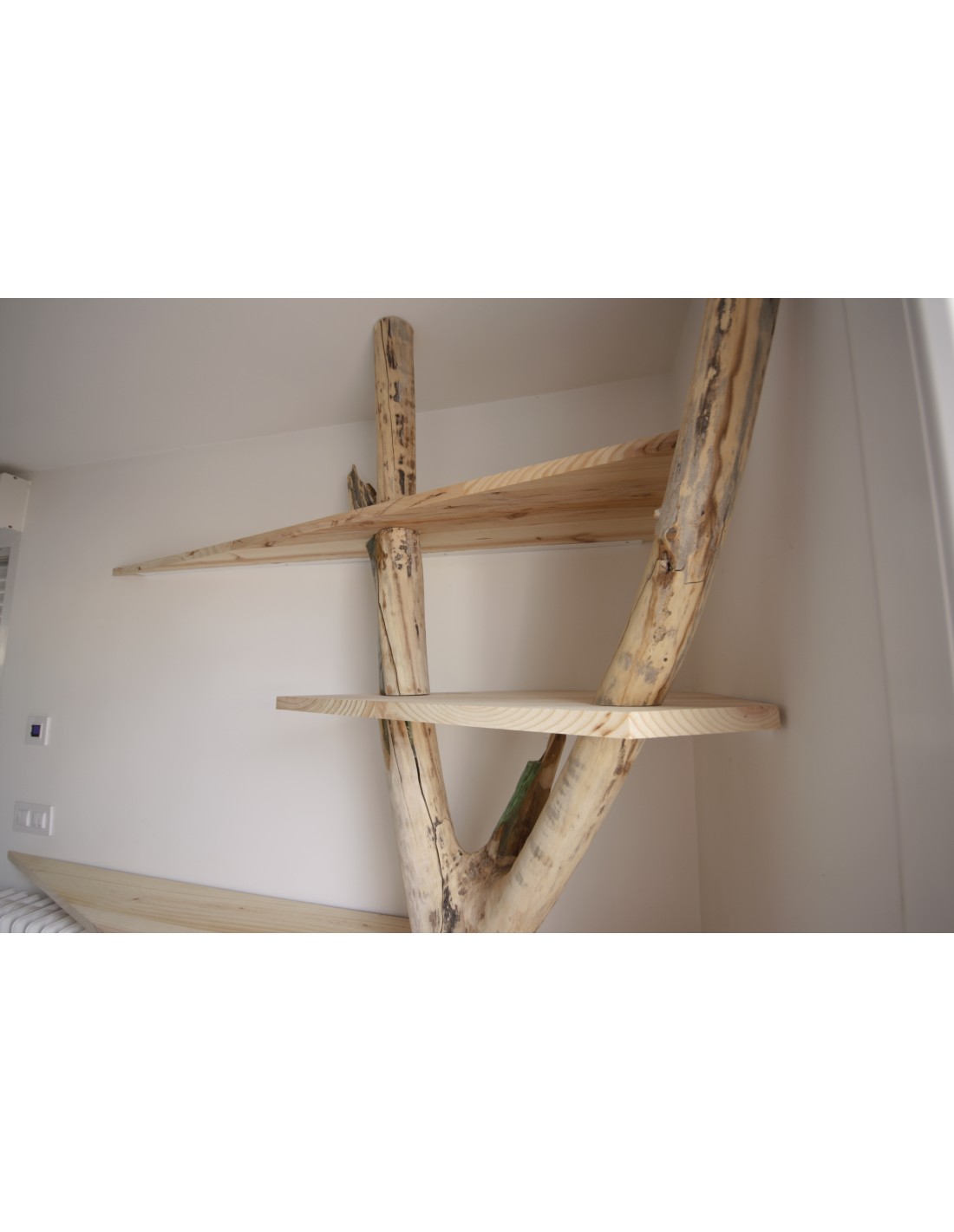 • Diseño a Medida: Las baldas de madera clara están cortadas con formas geométricas asimétricas, generando un dinamismo visual que evoca las ramas extendiéndose por su pared. El diseño se adapta perfectamente al rincón, optimizando el almacenamiento.