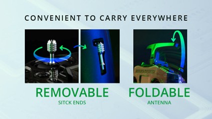 • Diseño portátil y ligero con extremos de palo extraíbles y antena plegable